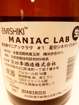今季はインテンスシリーズなど、恒久的なブランド構築を目指し、一連の仕込みの中で徐々に機軸となる「新しい笑四季スタイル」が確立していく中で、それとは別にさらなる実験的、あるいは新しい酵母、酒母仕込方法などを用いたより前衛的な酒質の設計を目標としたものが、このマニアックラヴシリーズです。