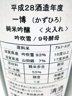 一博 純米吟醸 火入 吟吹雪 9号酵母 1800ml
