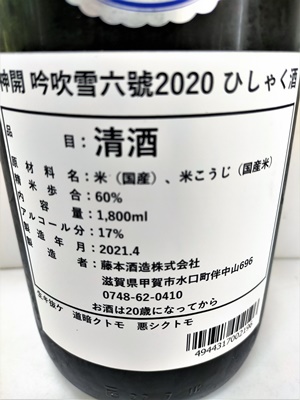 精米歩合‥60% アルコール度数‥17 使用酵母・・協会6号
