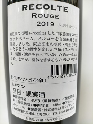 東近江市にある自社農園で収穫(=仏語 : recolte)したブドウを使用しています。東近江市の気候・風土で育まれたブドウの個性を楽しんで頂けると幸いです。清澄・濾過を行っていないので成分などが沈殿しますが、身体を害するものではありません。