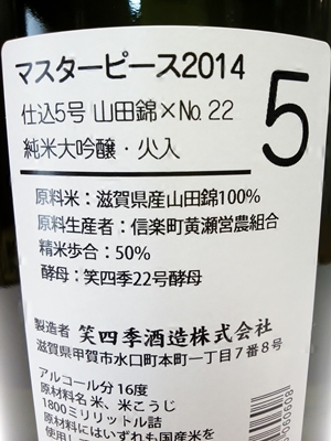 仕込5号と題しました本篇は酒米に滋賀県甲賀市信楽町黄瀬産の山田錦を使用し、食中を多分に意識した酢酸イソアミル、酢酸エチルを高生成する金沢酵母系の笑四季22号をセレクトしました。終始穏やかに香る桃、葡萄様の香りと香りを下支えする甘味が秀逸です。