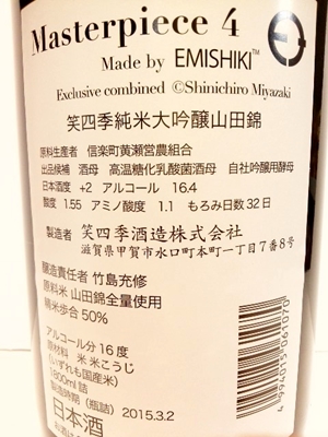 各種コンペにおける出品候補酒で、先に出た「マスターピース3号」とお酒のレベルとしては同等で対の関係にある酒です。お米は信楽産山田錦で酵母は協会6号と笑四季酵母(6号系だそう)のブレンド。