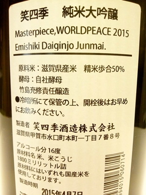 このお酒は国内及び輸出向け仕様で新たにワールドピースの名前がついてます。マスターピースの仕込み7号です。