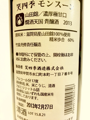 笑四季看板酒、モンスーン2013BYが蔵元貯蔵から出荷されました。